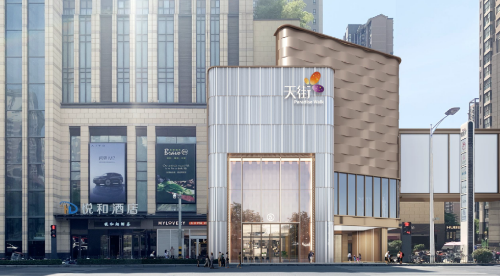 秉持着“空间即服务“的理念,本次升级针对项目外立面、灯光、地砖全面焕新。值得一提的是,外立面采用”曲水流觞”设计概念,运用国际一流超高小半径数码打印玻璃技术,打造波光粼粼的视觉特色。
