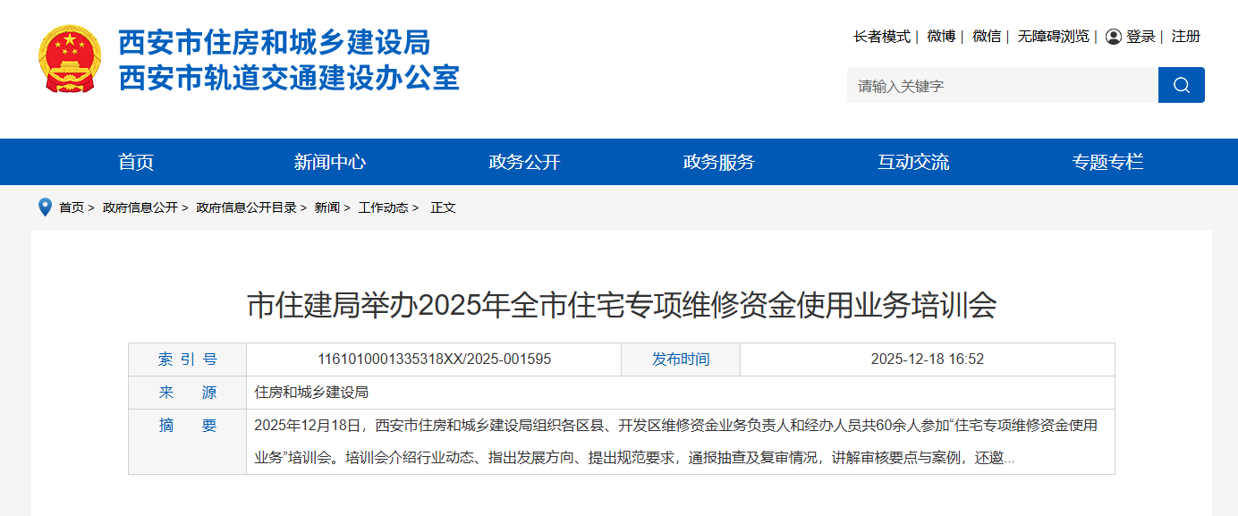 为进一步规范我市住宅专项维修资金使用审核工作,提高维修资金使用效率,防范维修资金使用审核环节的廉政风险。2025年12月18日西安市住房和城乡建设局组织各区县、开发区维修资金业务负责人和经办人员举办了“住宅专项维修资金使用业务”培训会,共60余人参加。