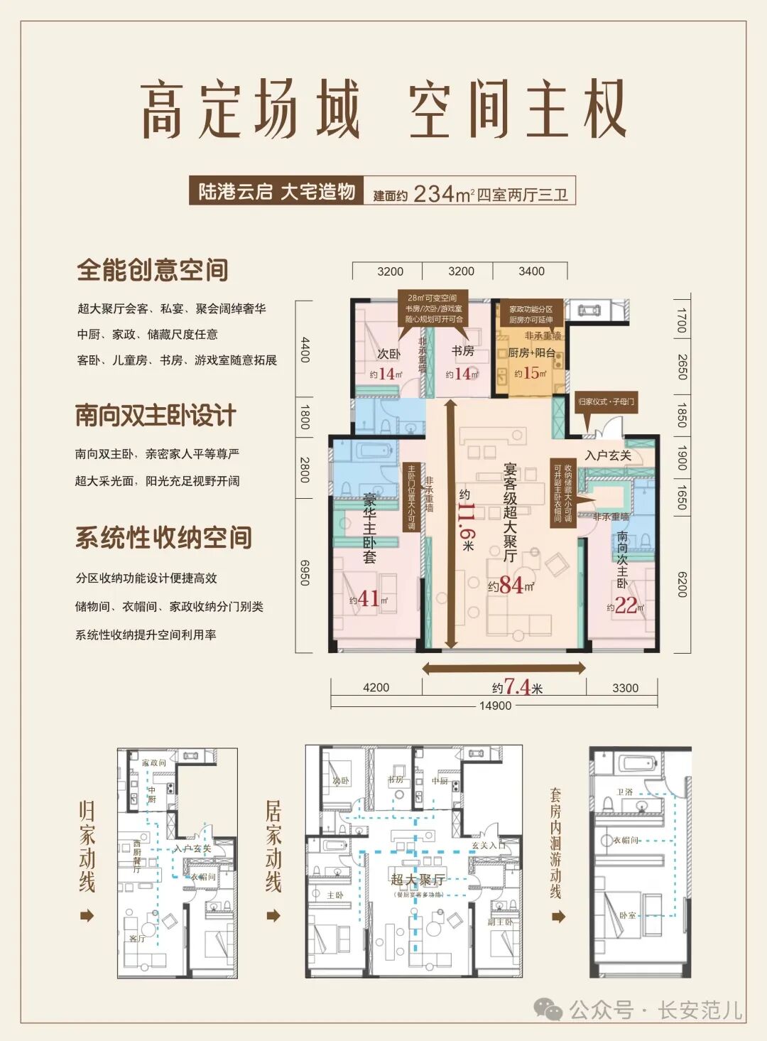 陆港·云启的楼王户型,秉承东方人居哲学“藏风聚气”的理念,以经典的四叶草户型设计,超越了功能的堆砌,致力于营造可传承百年的生活仪式与家族场景。以建面约234㎡的户型为鉴: