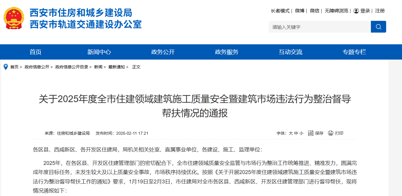 2025年,在各区县、开发区住建管理部门的密切配合下,全市住建领域质量安全监管与市场行为整治工作统筹推进、精准发力,圆满完成年度目标任务,未发生较大及以上质量安全事故,市场秩序持续优化。按照《关于开展2025年度住建领域建筑施工质量安全暨建筑市场违法行为整治督导帮扶工作的通知》要求,1月19日至2月3日,市住建局对全市各区县、西咸新区、开发区住建管理部门进行督导帮扶,现将情况通报如下: