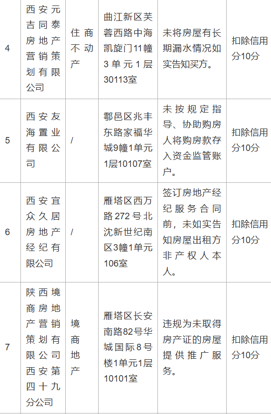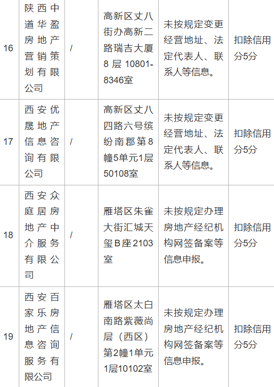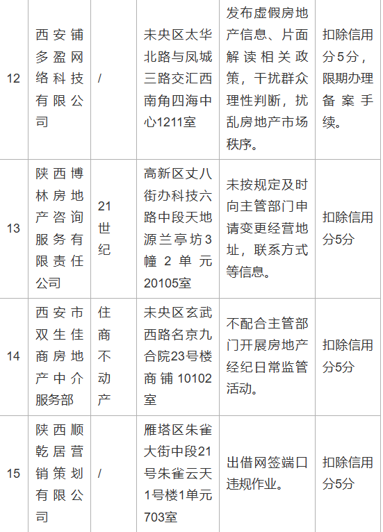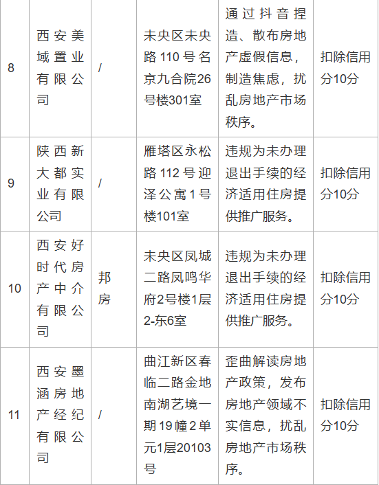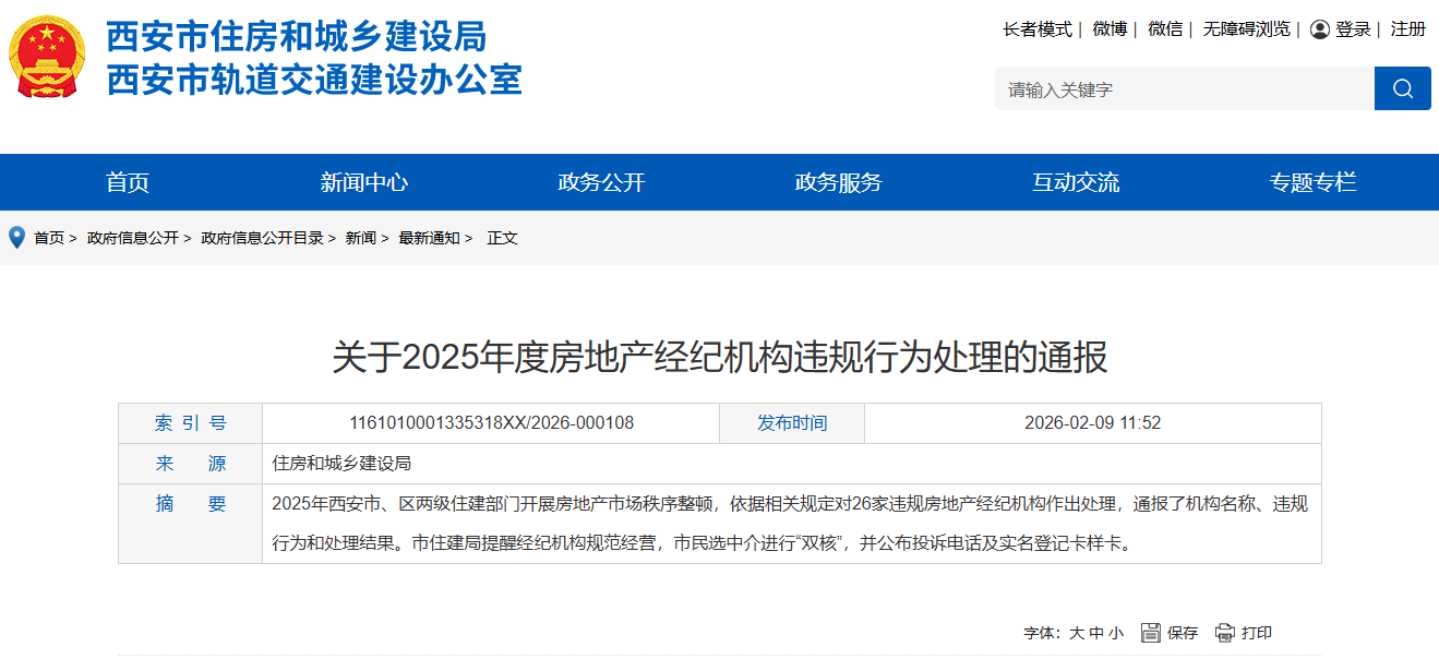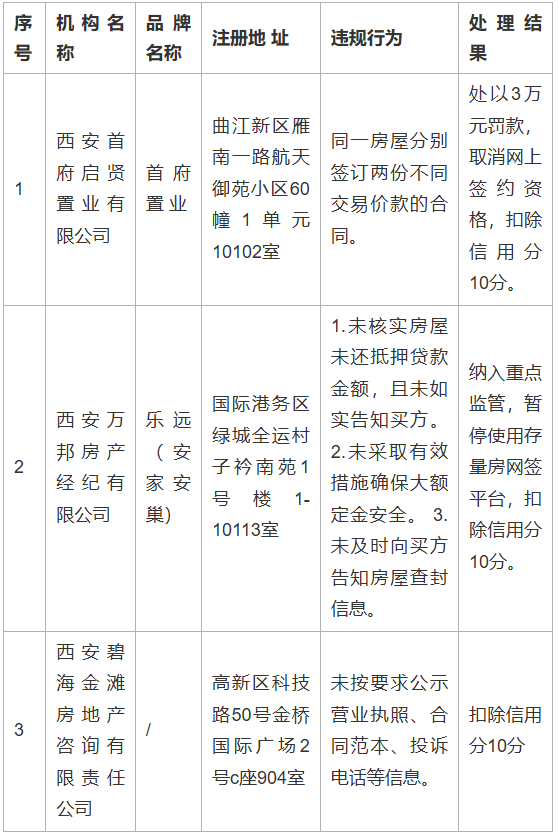 为维护房地产交易双方合法权益,2025年西安市、区两级住建部门持续开展市场秩序整顿,依据《房地产经纪管理办法》《西安市房地产经纪信用信息管理办法》等规定,对违规经营、扰乱秩序、损害消费者合法权益的房地产经纪机构作出处理,现将有关情况通报如下: