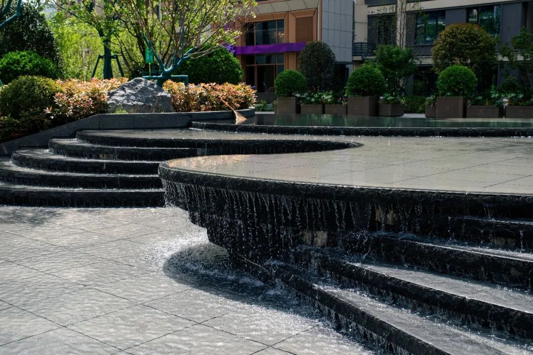 中庭以蜿蜒曲线构图,水的意象串联始终——时而汇成浮岛下的静水面,时而化作溪谷间的涓涓细流,时而又变为孩童戏耍的浅滩,不同景观场景与业主对话。