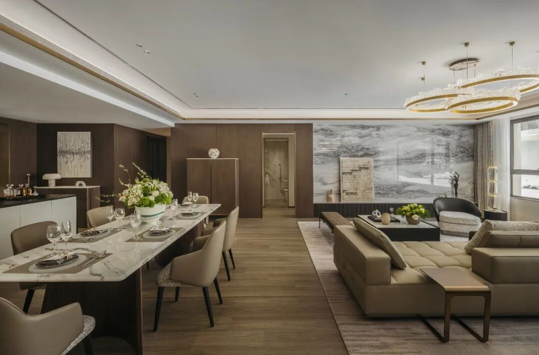 客餐厅空间约为84㎡,客厅面宽约7.4米,充裕尺度让客厅承载更丰富的功能场景。餐厅区则可从容放置8人大长桌,同时可容纳西厨岛台与餐边柜。主卧套房约41㎡,睡眠区整体进深约6.95米。既可规划双面衣帽间,也可布置工作台或化妆区,甚至可摆放茶几与休闲沙发,强化空间社交属性,提升居住体验。